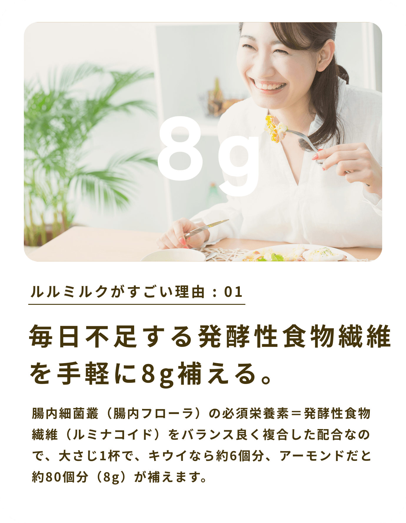毎日不足する発酵性食物繊維 を手軽に8g補える。
