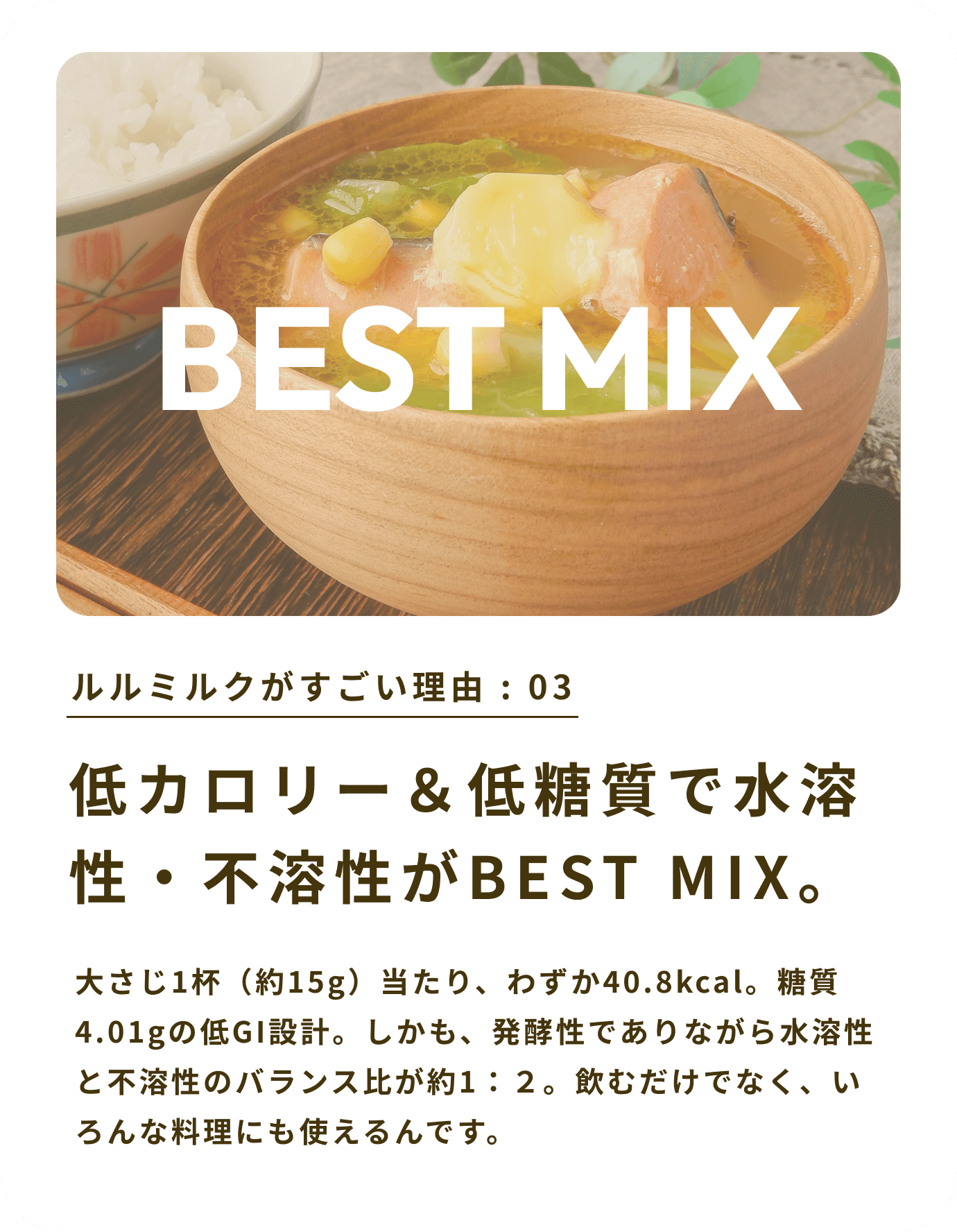 大さじ1杯(約15g)当たり、わずか40.8kcal。糖質4.01gの低GI設計。しかも、発酵性でありながら水溶性と不溶性のバランス比が約1:2。飲むだけでなく、いろんな料理にも使えるんです。