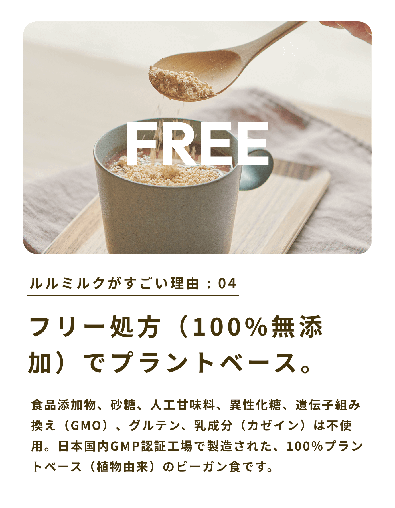 食品添加物、砂糖、人工甘味料、異性化糖、遺伝子組み換え(GMO)、グルテン、乳成分(カゼイン)は不使用。日本国内GMP認証工場で製造された、100%プラントベース(植物由来)のビーガン食です。